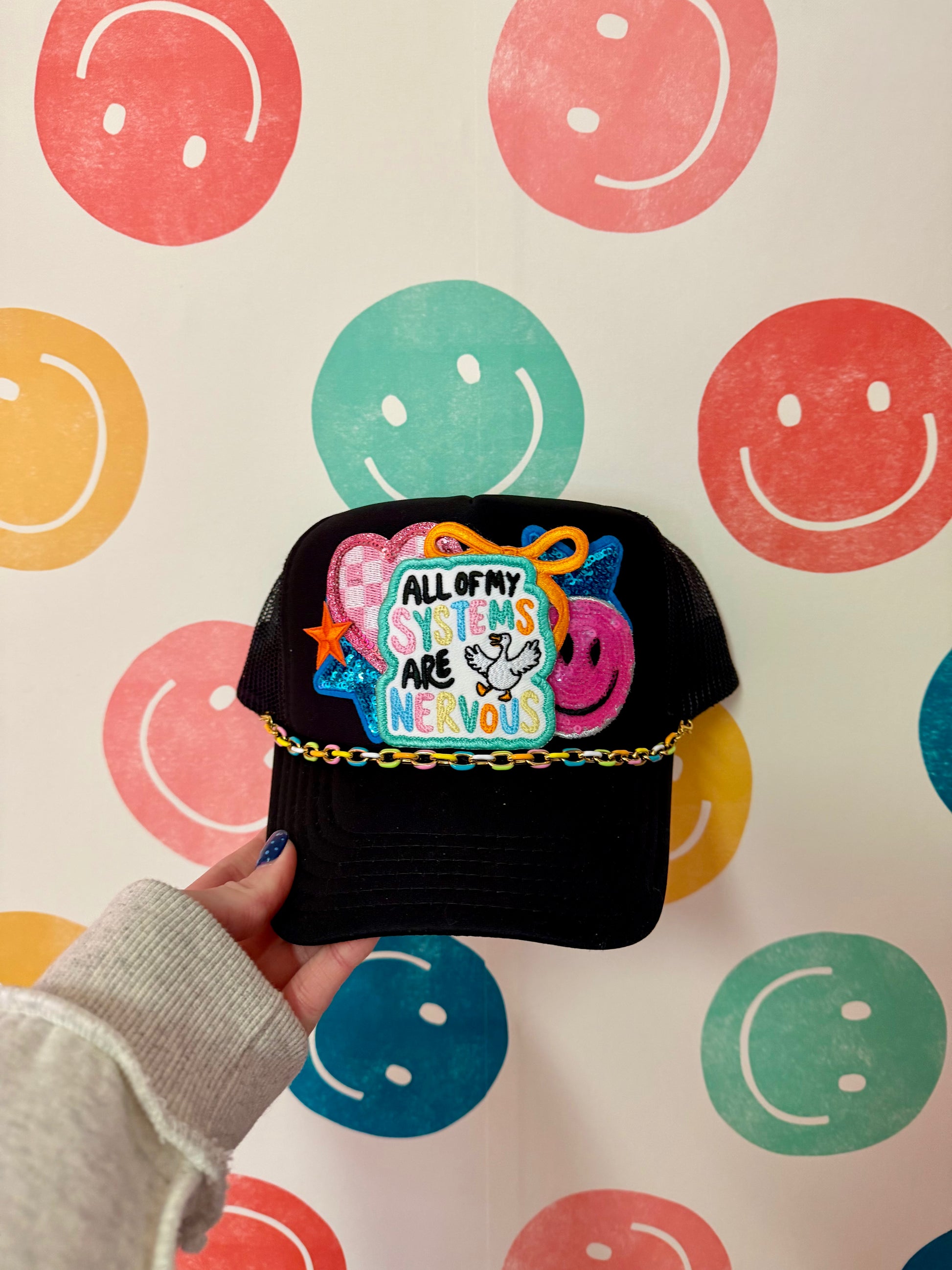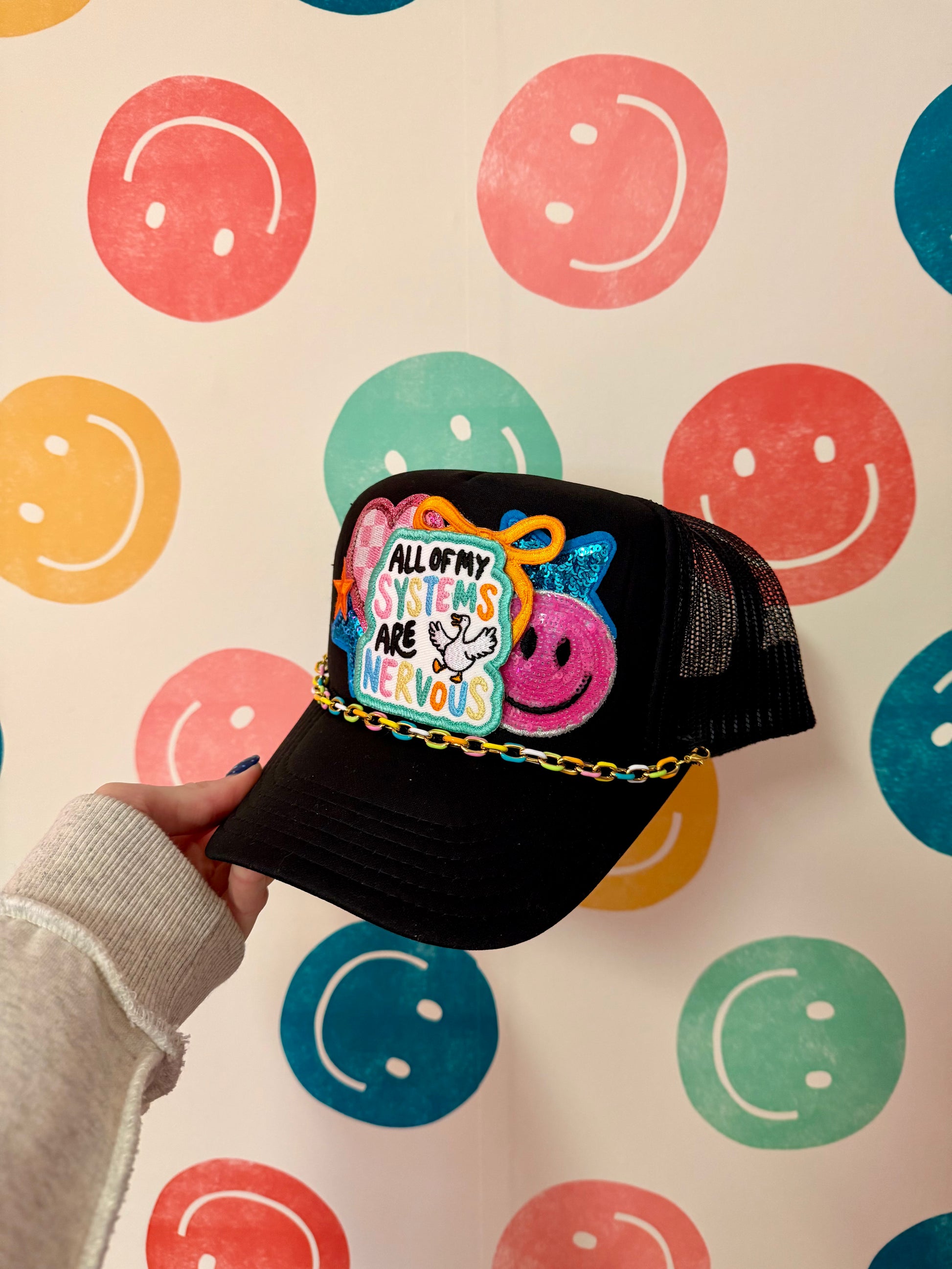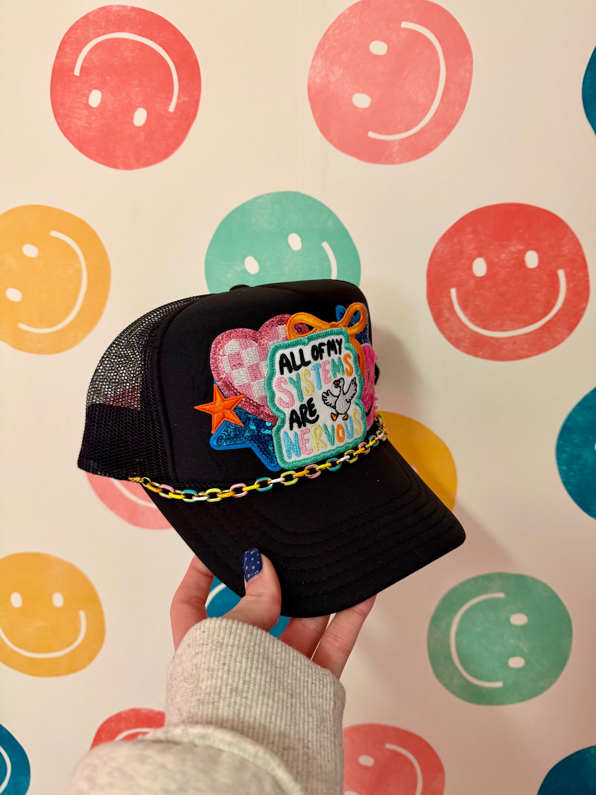 All My Systems are Nervous Black Trucker Hat Feel the vibe of the Dilly Dally collection with this bold statement trucker hat. Featuring a classic black colorway and structured trucker silhouette, it's the perfect accessory to express your mood and match your collection. Comfortable mesh back keeps you cool while the curved bill delivers timeless style. Make it part of your Dilly Dally wardrobe today.
